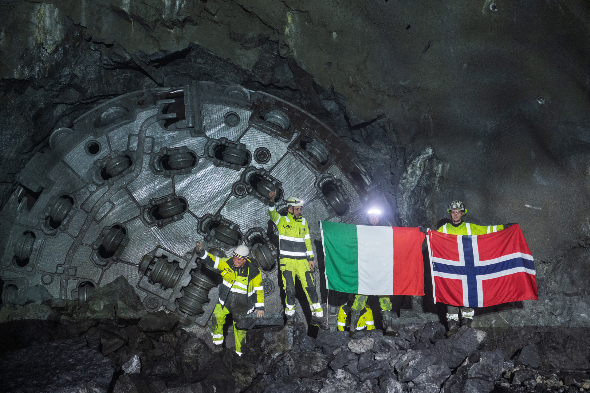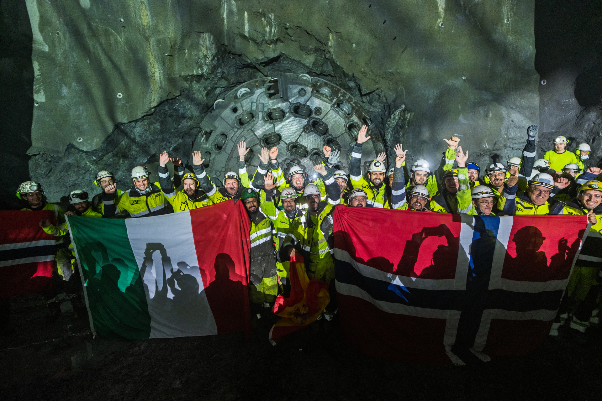 With around 300 guests present, the enormous machine bored through the final section of rock and emerged into a festively decorated cavern at Huseby. Workers stepped out of the machine carrying Norwegian, Italian and Portuguese flags, greeted by cheering colleagues offering hugs and congratulations. An important milestone in a major project had been reached.