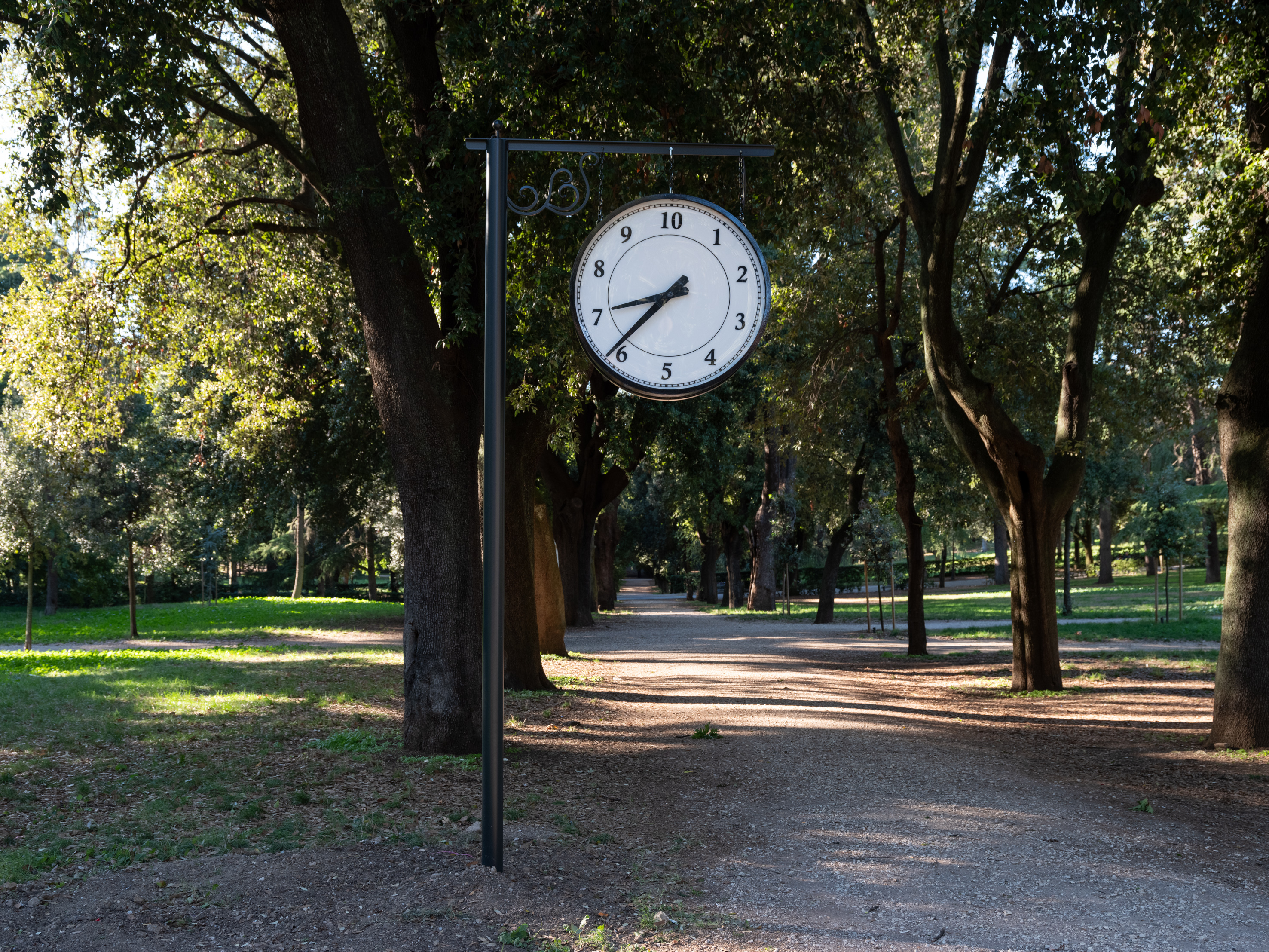 For this fourth edition, Ruth Ewan recreated a typical element of Roman street furniture—the pole traditionally used to mount public clocks—and installed a clock from the series We Could Have Been Anything That We Wanted to Be (2011), which uses decimal time inspired by the French Republican Calendar, inviting the public to rethink how time is measured.